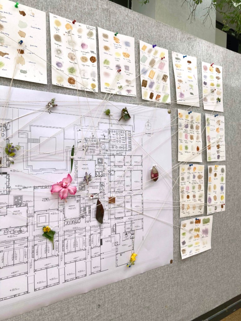 Being an architectural college and as all participants were aspiring architects, it seemed like an obvious exercise in plotting the many plant sources they had foraged on to a site map of the campus, along with their swatch cards. The result was this beaming board of plant inks, handwritten colour names, and an exercise in making visual links with our surroundings (both natural and human-made).