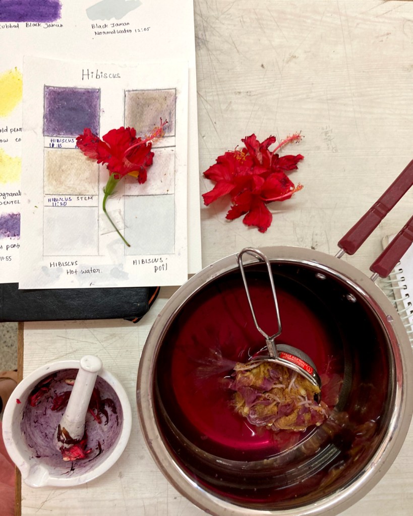 At the outset, the core activity of this workshop was of extracting colours from natural sources. Yet, it simply served as a means to some specific learnings that I have built into the assignments–particularly for the TikTok and Reels generation. These learnings begin with making observations, then to document those observations in as much detail as possible, and re-introduced the need to find and create links between oneself and the environment around. Doing all these through the act of extracting colours from nature makes the entire process that much more engaging, don’t you think?