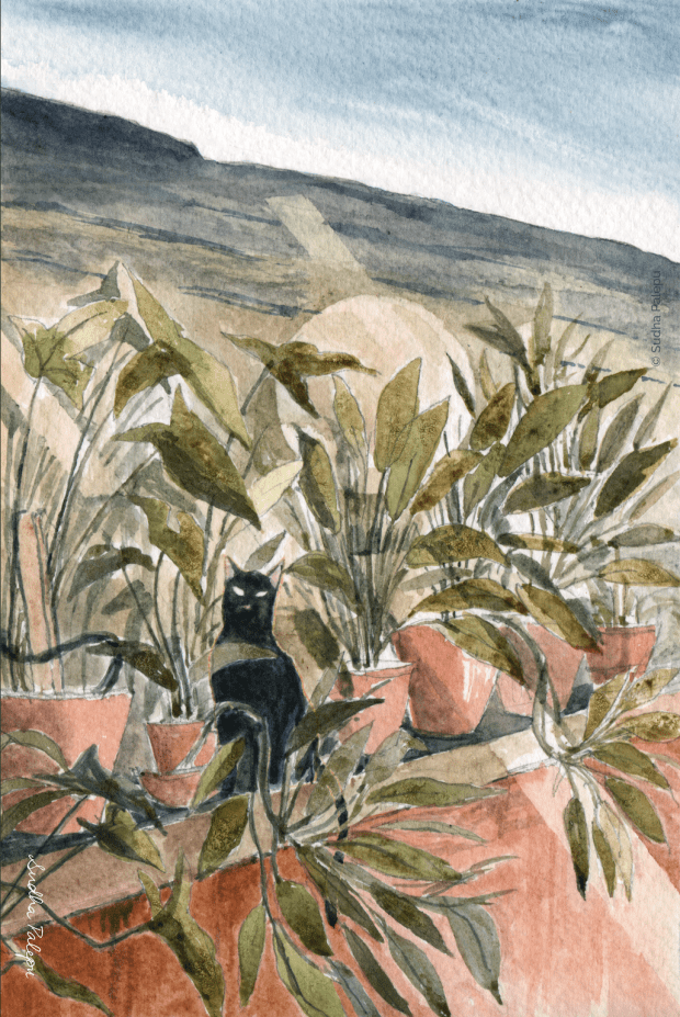 Ink from hibiscus flower dye, curry leaf dye and avocado skin dye; watercolour made from bought indigo pigment, on watercolour paper